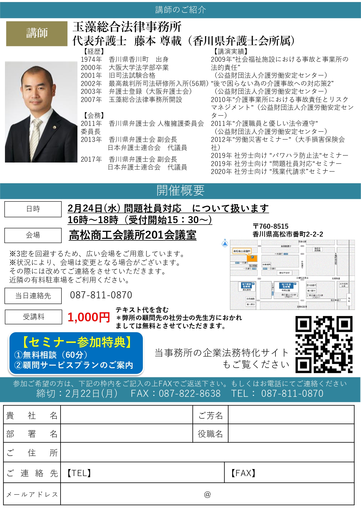 - 2022年7月6日(水)に企業経営者向け「問題社員対応セミナー」(新居浜市)を開催いたします。