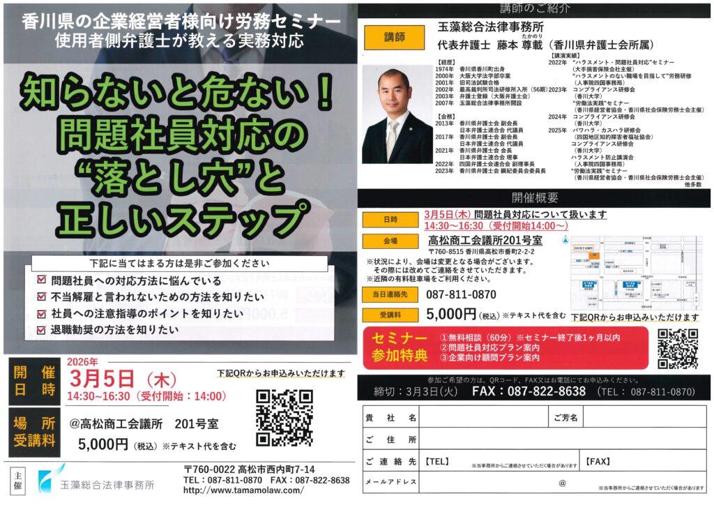 - 【企業経営者様向け】『問題社員対応の”落とし穴”と正しいステップ』セミナー開催のお知らせ - 2月 20, 2026